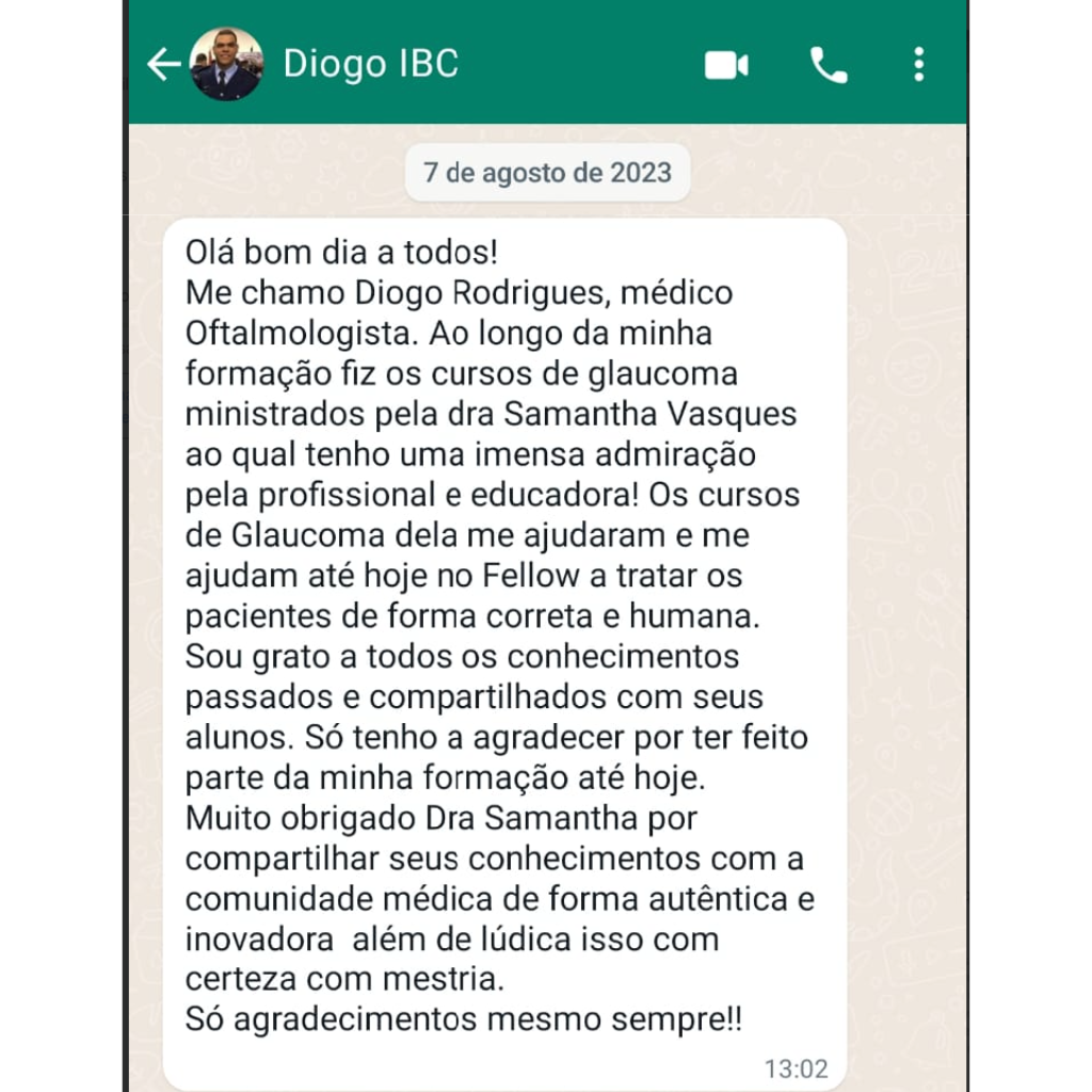 Meu nome é Samantha, sou oftalmologista especialista em glaucoma e dedico minha carreira à formação de médicos oftalmologistas e especialistas na área. Atendo exclusivamente pacientes particulares com glaucoma e compartilho meu conhecimento para que mais profissionais possam oferecer o melhor cuidado aos seus pacientes.